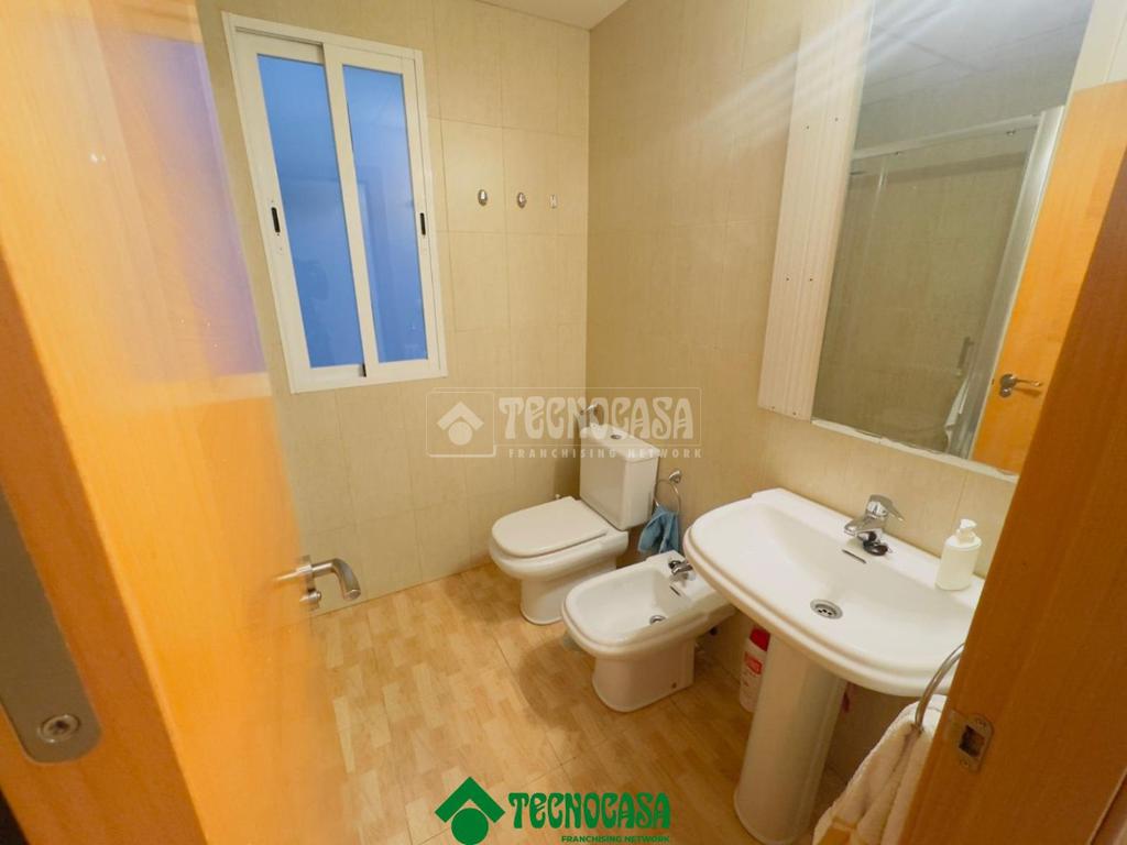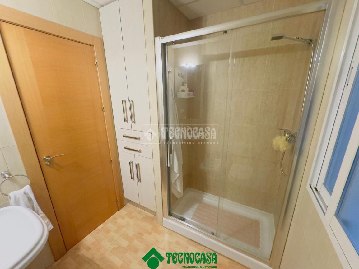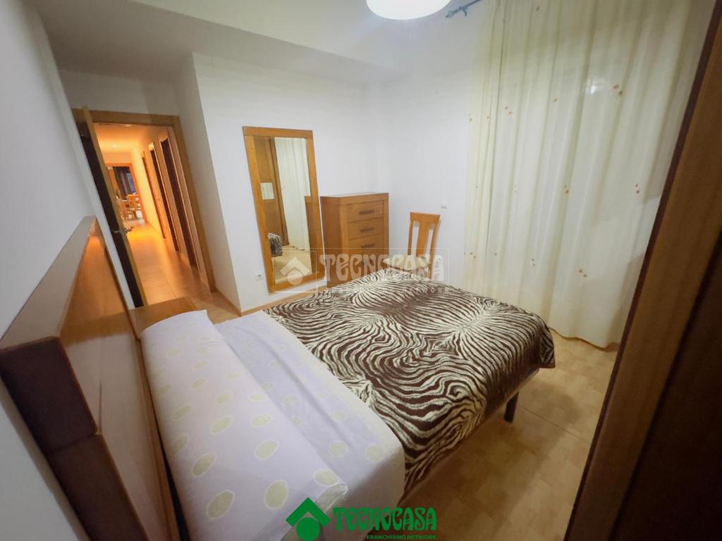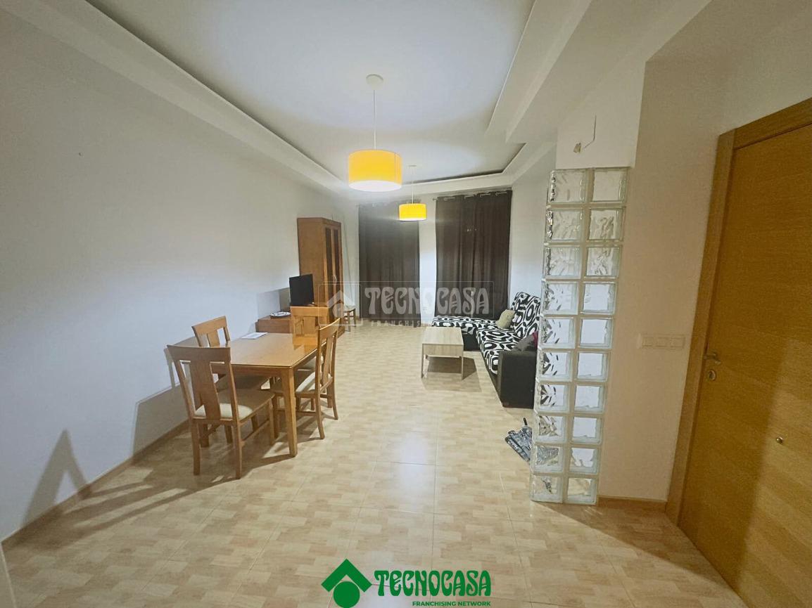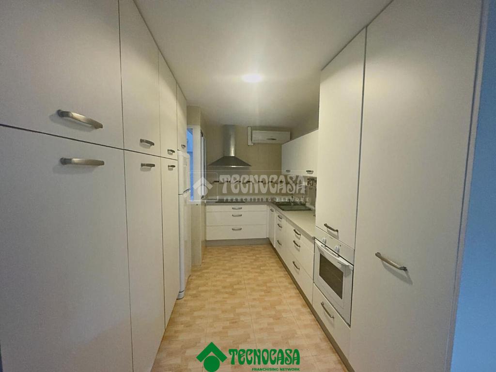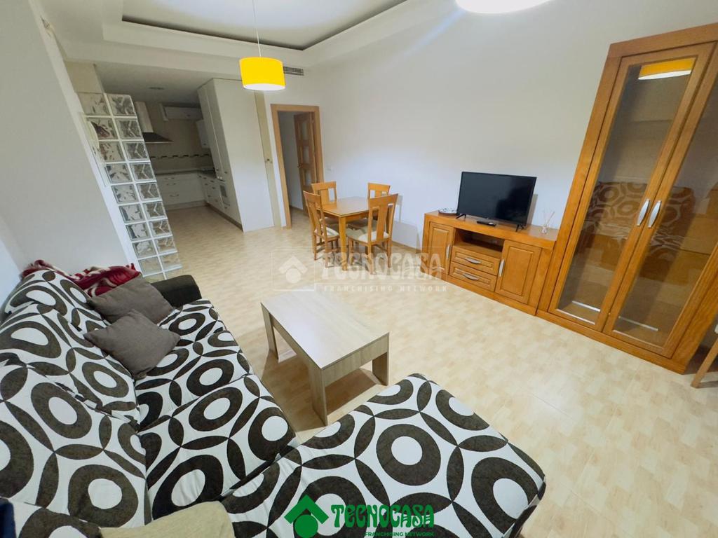 La vivienda presenta una distribución funcional y cómoda, comenzando por un salón muy luminoso, gracias a sus ventanas orientadas al exterior, que comparte espacio con una cocina completamente equipada con mobiliario, electrodomésticos y aire acondicionado, ofreciendo un ambiente moderno y práctico.